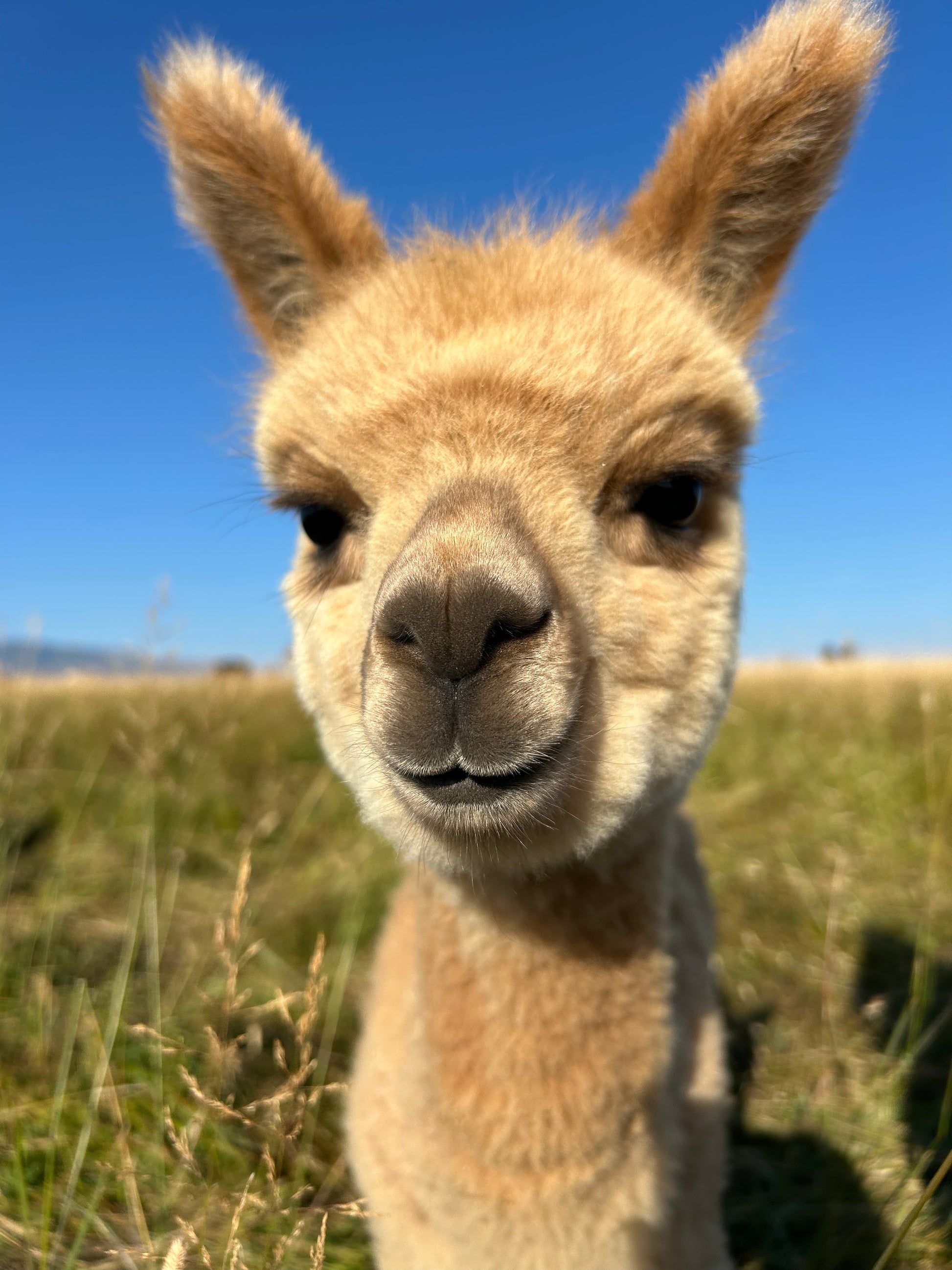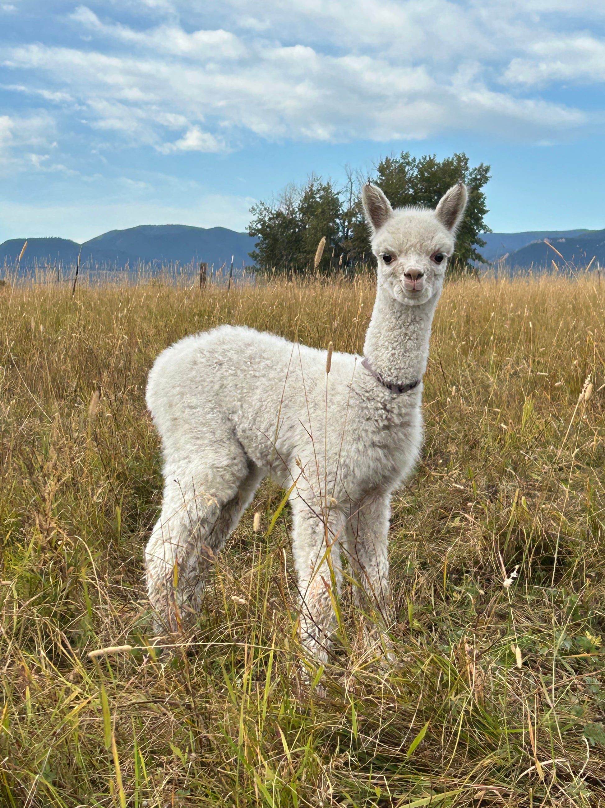 Born in mid-June, Crown Princess already carries herself with a playful curiosity and quiet confidence. She’s the kind of cria visitors pause for — a little star in the pasture and a favorite among those who meet her.