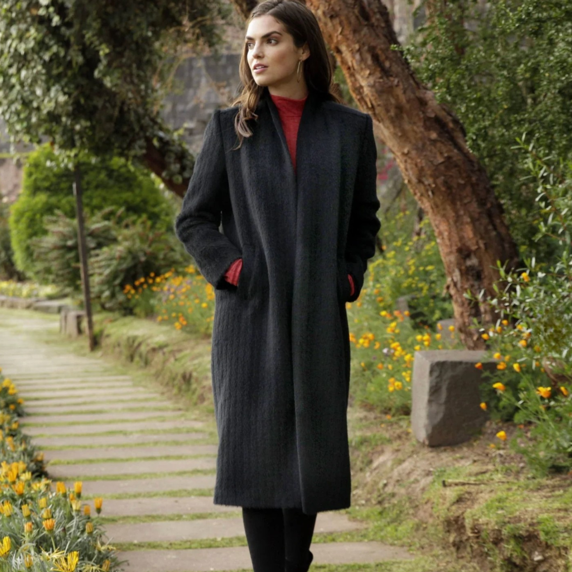 Crafted from exceptionally rare Suri alpaca fiber, this long, flowing coat embodies understated opulence for those who value refinement and craftsmanship. Suri alpaca represents less than 10% of the world’s alpaca population, prized for its naturally silky drape, subtle luster, and liquid-smooth movement — often compared to cashmere and silk, yet warmer and far more durable.